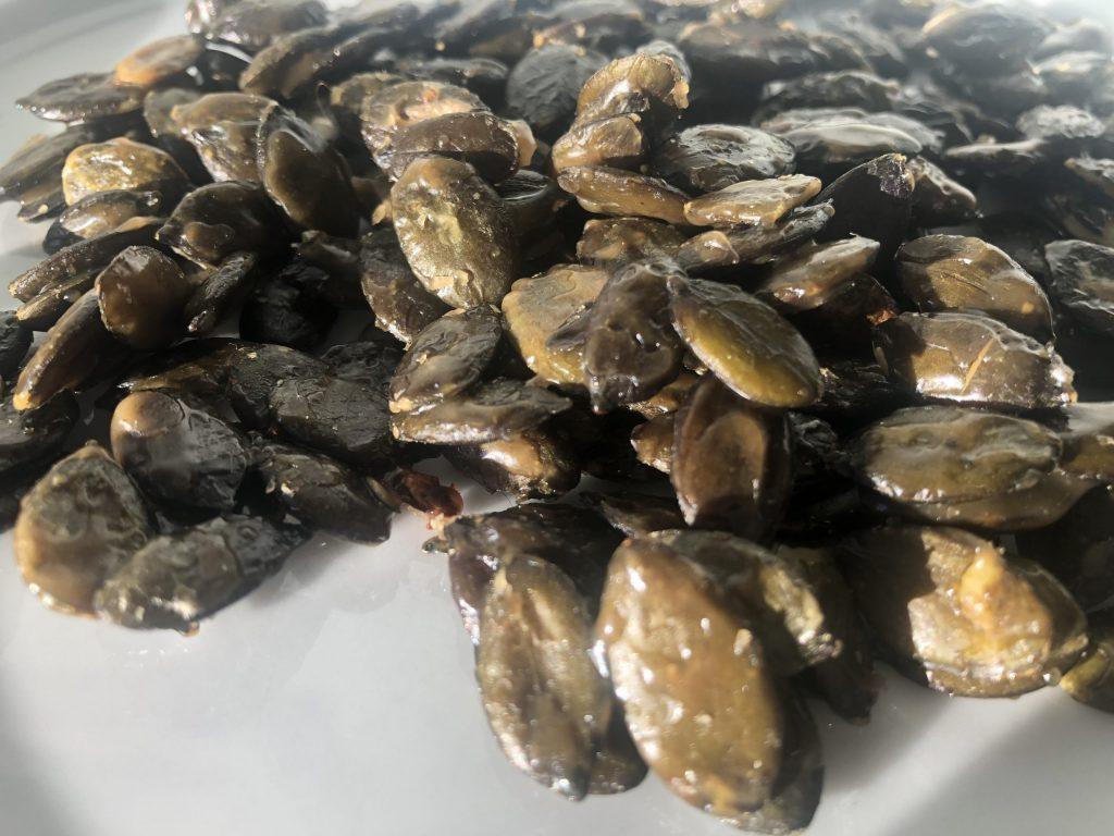Röste die Kürbiskerne in der Pfanne bei mittlerer Hitze ohne Fett, bis sie knacken und gib sie danach in eine Schüssel. In die gleiche Pfanne gibst Du die restlichen Zutaten und rührst so lange, bis der Zucker anfängt zu karamellisieren und braun zu werden. Nimm die Pfanne dann vom Herd, gib die gerösteten Kürbiskerne hinein und rühre vorsichtig um. Schütte die Masse auf ein Backblech und warte ein paar Minuten, bis sich die karamellisierten Kürbiskerne abgekühlt haben.