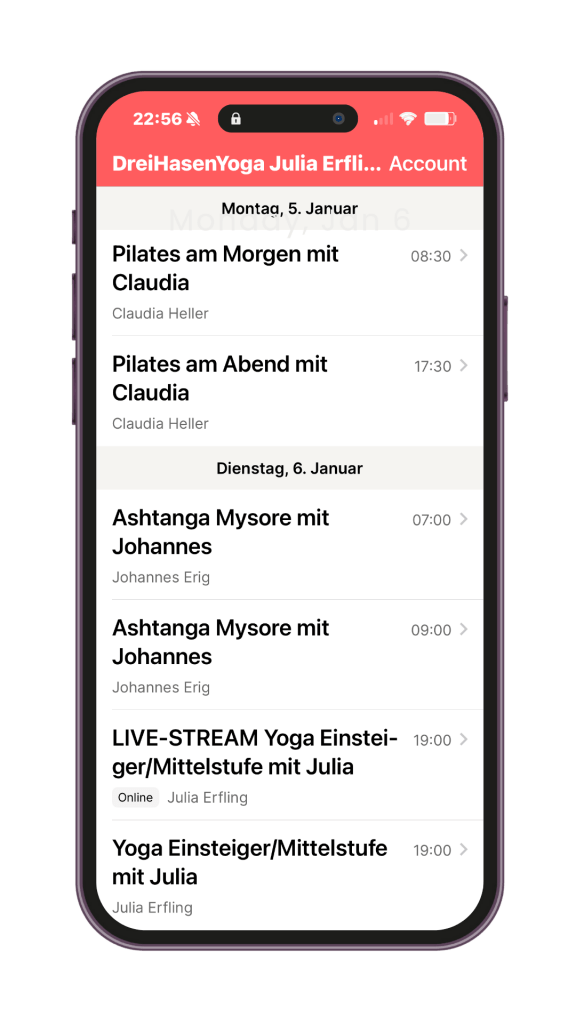 Wenn Du eine flexible Fünferkarte nutzt oder über Sportnavi/Hansefit teilnimmst, kannst Du Dich frühestens 7 Tage vor Kursbeginn in Deine Wunschklasse einbuchen und Dir einen Mattenplatz sichern. Ist ein Kurs voll, setzt Du Dich einfach auf die Warteliste – wenn ein Platz frei wird, erhältst Du automatisch eine E-Mail.